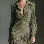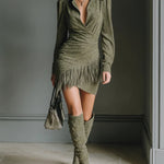 Ta oliwkowa zielona sukienka mini z fausz suede oferuje idealne połączenie szykownej elegancji i nowoczesnego stylu. Dekolt w serek i fason kopertowy tworzą korzystną sylwetkę, podczas gdy miękki materiał z fausz suede dodaje luksusowej tekstury. Idealna na swobodne wyjścia lub wieczorne wydarzenia, ta sukienka łączy styl, komfort i wszechstronność, tworząc naprawdę podniesiony wygląd.