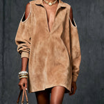 Nowoczesny design: Detal z odkrytymi ramionami dodaje modnego, stylowego akcentu do klasycznej sylwetki sukienki koszulowej, tworząc odważny, a zarazem kobiecy wygląd.