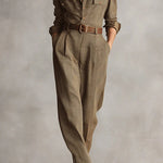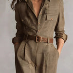Ten kombinezon charakteryzuje się ponadczasowym wzorem w kratę, z ostrym kołnierzykiem i pełnym zapięciem na guziki. Dopasowany krój podkreślony jest plisowanym przodem i paskiem w talii z odważną klamrą. Długie rękawy z mankietami i wyraźnymi szwami na ramionach dodają elegancji, podczas gdy zwężane nogawki tworzą czystą, wydłużoną sylwetkę idealną na wyrafinowane, codzienne stylizacje.