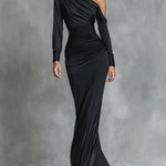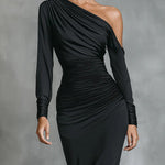 Asymetryczny design na jedno ramię — uderzający, wyrafinowany i natychmiast korzystnie podkreślający sylwetkę.