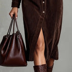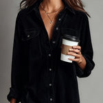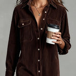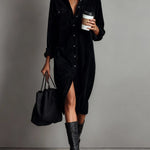 Ta sukienka koszulowa ma luźny krój z zapięciem na guziki z przodu i spiczastym kołnierzem, co nadaje jej swobodnej elegancji. Długie rękawy są luźno podwinięte, a dwie kieszenie na klatce piersiowej dodają funkcjonalności. Miękka tekstura sztruksu wprowadza przytulne, codzienne uczucie, podczas gdy długość do kolan i delikatnie zaokrąglony dół sprawiają, że jest idealna na swobodne dni w stylu.