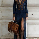 Ta oszałamiająca sukienka maxi inspirowana zachodem łączy bohemyjski styl z nutą vintage. Projekt z półzamkiem i misternym haftem wzdłuż dekoltu dodaje charakterystycznego, szykownego akcentu, podczas gdy detale z frędzlami na dole nadają jej zabawny, wolny nastrój. Wykonana z miękkiej ekoskóry, ta sukienka jest idealna do wyrażania siebie na festiwalach, nieformalnych spotkaniach czy wieczornych wyjściach.