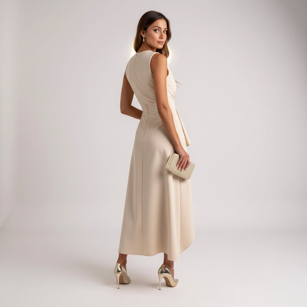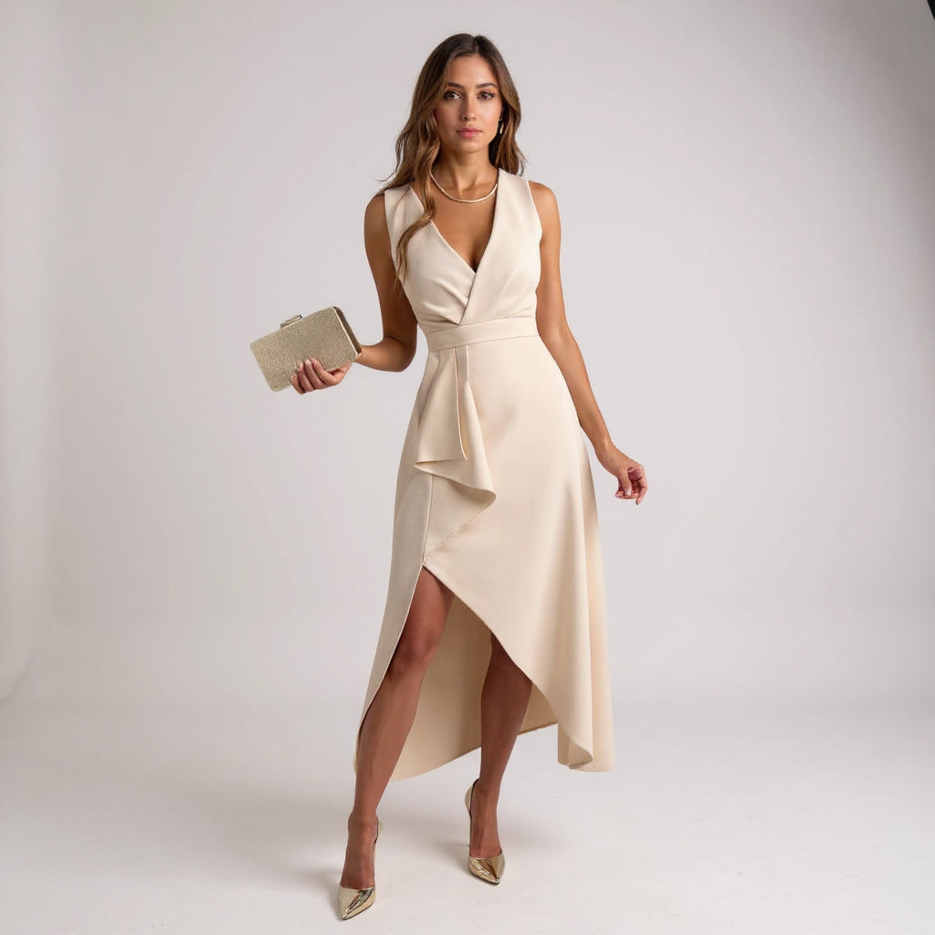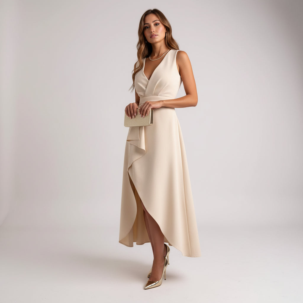 Sukienka Júlia Elegant Midi uchwyca istotę wyrafinowanej kobiecości. Dzięki pięknie uformowanemu dekoltowi w kształcie litery V, delikatnie ustrukturyzowanej górze i płynnemu asymetrycznemu dołowi, ta sukienka tworzy sylwetkę, która jest zarówno klasyczna, jak i nowoczesna. Kaskadowy przód dodaje delikatnego ruchu, czyniąc ją idealnym wyborem na wesela, eleganckie kolacje lub każdą okazję, na której chcesz wyglądać elegancko i bezwysiłkowo olśniewająco.