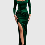 Ta luksusowa suknia syrenka została zaprojektowana, aby przyciągać uwagę. Bogaty, aksamitny materiał opina ciało w odpowiednich miejscach, z dramatycznym rozcięciem, które dodaje odrobiny zmysłowej wyrafinowania. Kwadratowy dekolt i marszczona talia tworzą sylwetkę podkreślającą figurę, podczas gdy długie rękawy zapewniają elegancki kontrast. Idealna na galę lub elegancki wieczór, ta sukienka łączy ponadczasowy urok z nowoczesnym stylem.