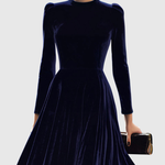 Przyjmij wyrafinowaną elegancję z tą oszałamiającą granatową aksamitną midi sukienką — arcydziełem ponadczasowego uroku i stonowanego glamouru. Miękka, płynąca tkanina łapie światło przy każdym ruchu, podczas gdy dopasowany korpus i rozkloszowany dół tworzą piękną, kobiecą sylwetkę. Idealna na wieczorne wydarzenia, formalne kolacje lub zimowe uroczystości, emanuje cichą pewnością siebie i klasycznym urokiem.