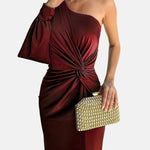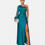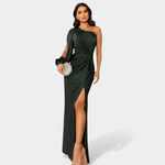 Ta elegancka, jednoramienna suknia to idealne połączenie klasy, nowoczesności i wyrafinowanego kroju. Zmysłowe drapowanie oraz wysoki rozporek nadają sylwetce lekkości i podkreślają jej naturalne kształty. Model sprawdzi się na wyjątkowe okazje, od gal po wieczorne przyjęcia, gwarantując wygląd pełen stylu i luksusu.