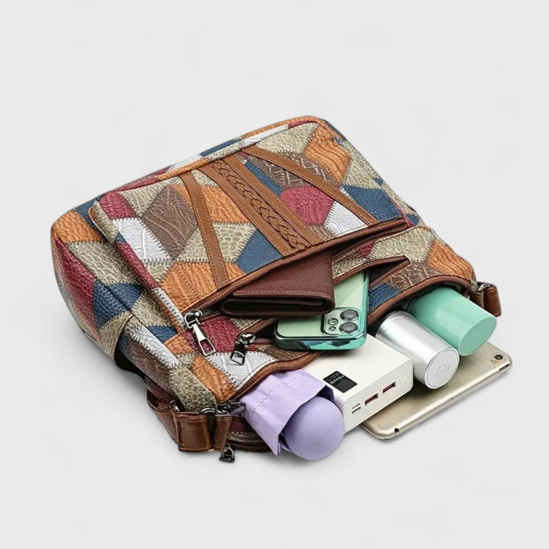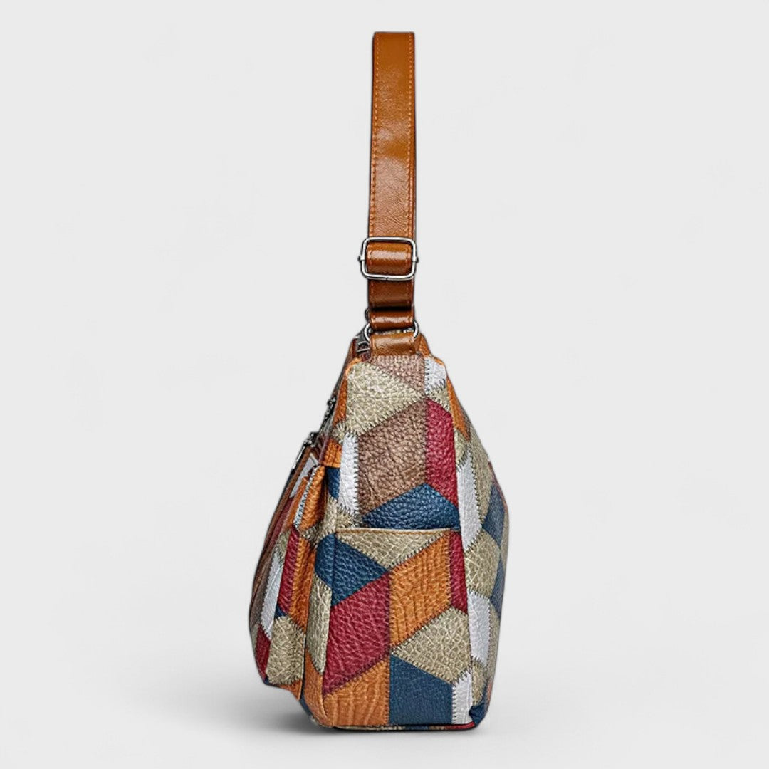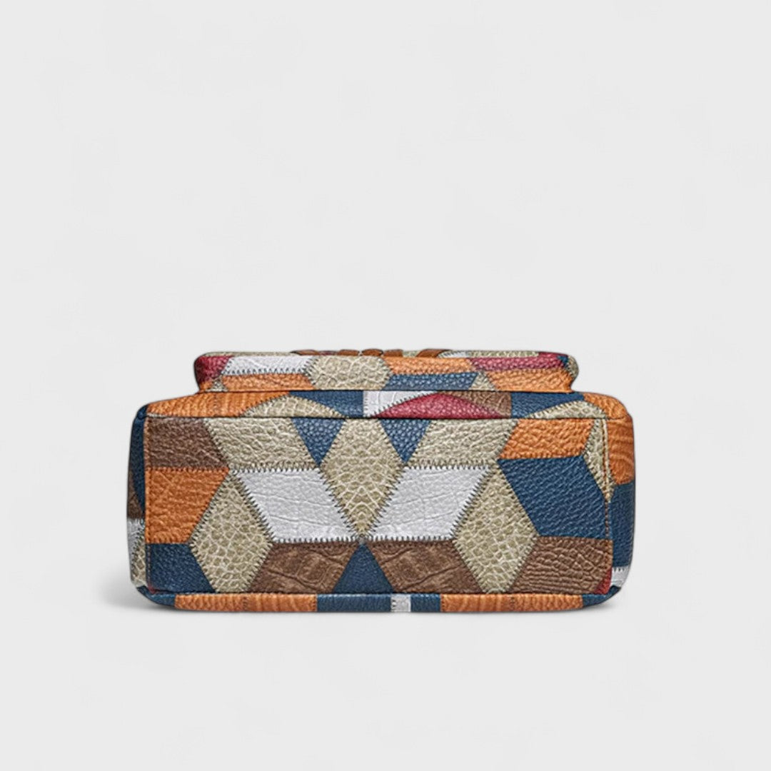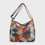 Dzięki bogatemu geometrycznemu patchworkowi, eleganckim akcentom ze skóry i dużym przegrodom, ta torba łączy wyrafinowany styl z praktycznością, umożliwiając łatwe przechowywanie wszystkich codziennych niezbędnych rzeczy.