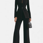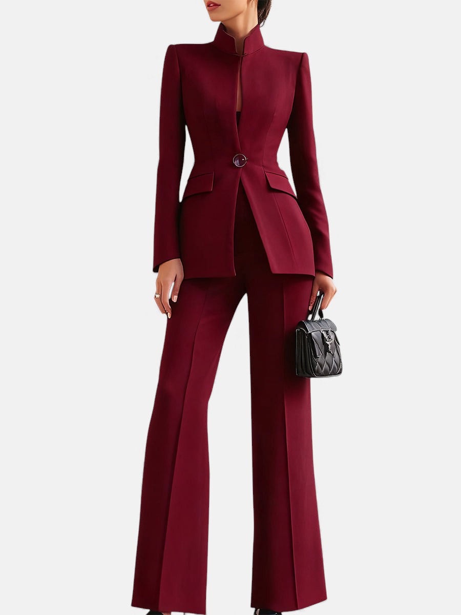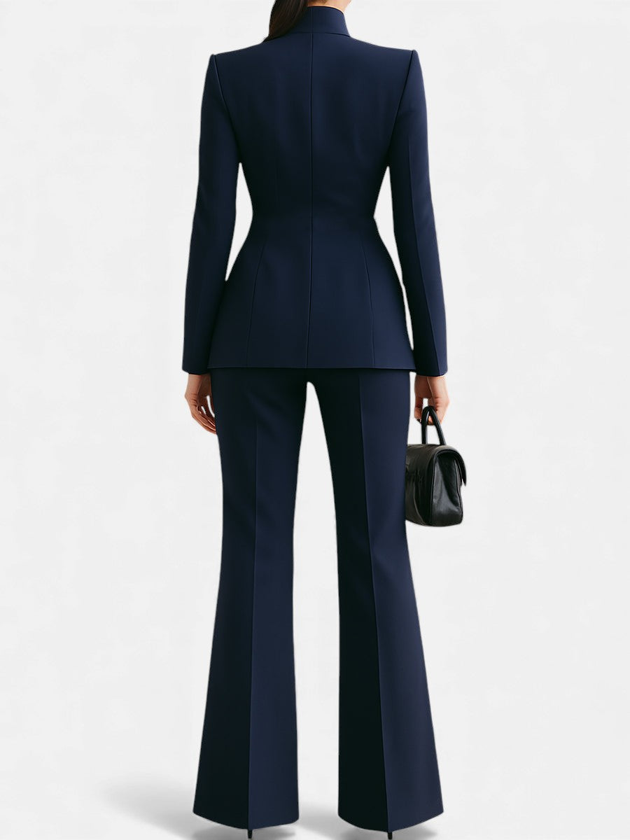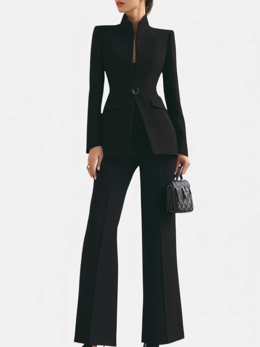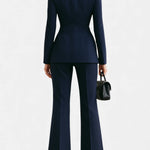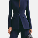 Ten szykowny komplet biznesowy łączy w sobie nowoczesny krój z ponadczasową klasą. Starannie dopasowana marynarka i spodnie o wydłużającej sylwetkę linii tworzą look, który emanuje pewnością siebie i prestiżem. Idealny zarówno do biura, jak i na ważne spotkania — podkreśla styl, nie wymagając żadnych kompromisów.