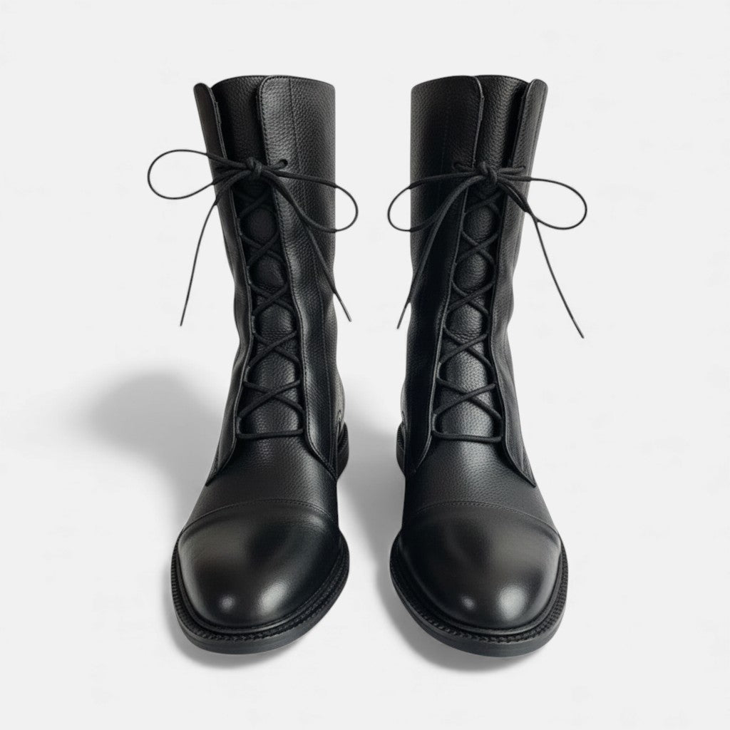 Eleganckie czarne botki skórzane o wyjątkowym designie, który łączy matowe i błyszczące wykończenie. Posiadają smukłą linię, z przodu sznurowanie dla pewnego dopasowania oraz nowoczesną estetykę, która pasuje zarówno do codziennych, jak i wieczorowych stylizacji. Ich minimalistyczny design sprawia, że łatwo je dopasować do sukienek, spódnic lub skinny jeans.